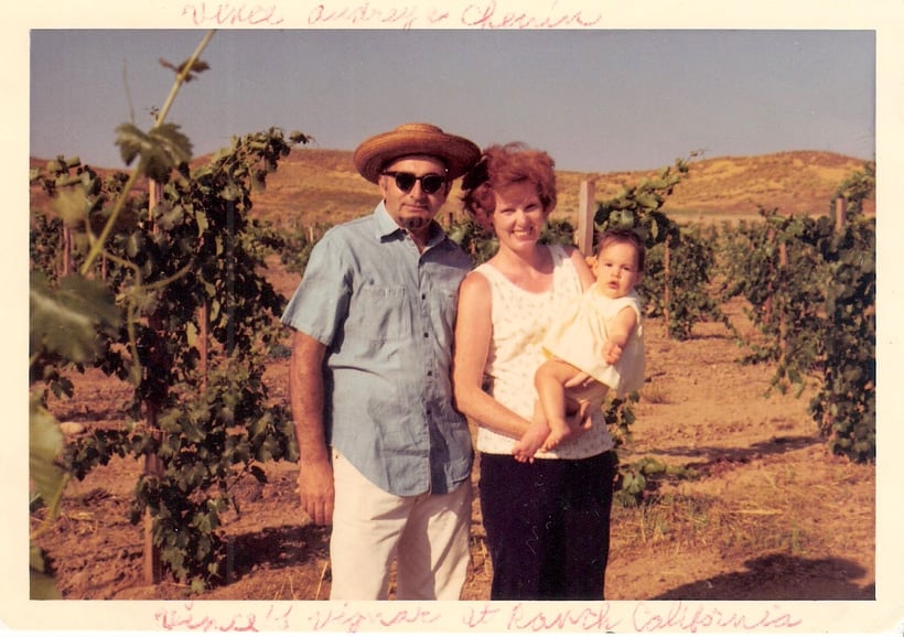 The family that labels together sticks together! Vincenzo, Audrey, and Chenin Cilurzo in their Chenin Blanc vineyard. Summer, 1969.